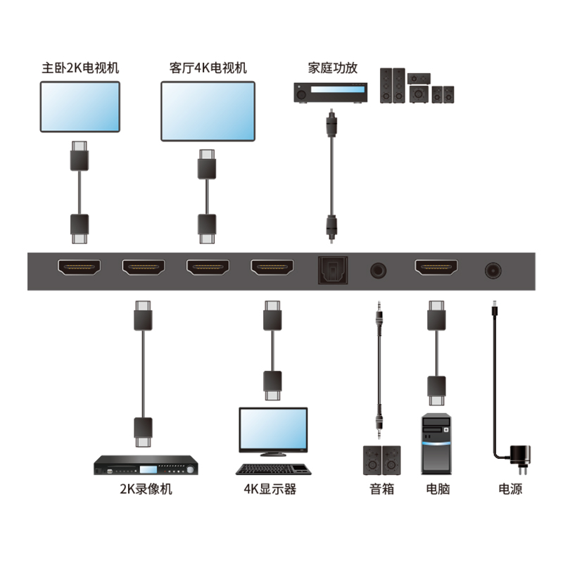 4 x HDMI Type A [19-pin母口] 1 x L/R 音频端口 [3.5mm Stereo Mini-jack] 1 x 光纤音频端口 [S/PDIF] |
