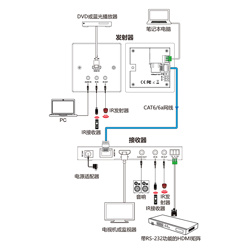 1, 标准 HDBaseT 技术,支持 HDMI和模拟音频接入,4K 最远 40米,1080P 最远 70米传输