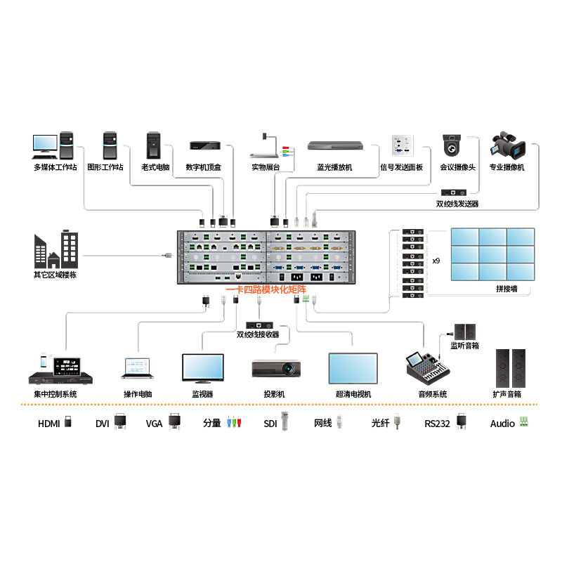 2, 4K、2K HDMI/DVI/SDI/VGA/复合视频/分量视频/HDBaseT/光纤等多种类板卡混插混用;