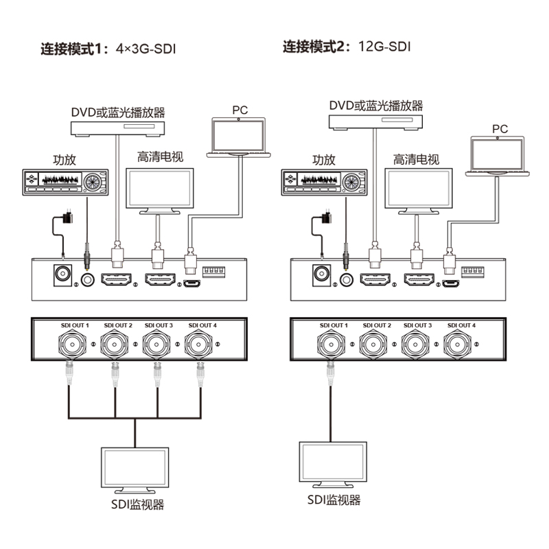 1, 1路HDMI2.0 4K 输入,1路12G-SDI 以及3路3G-SDI输出,1路HDMI环路输出1路模拟音频输入