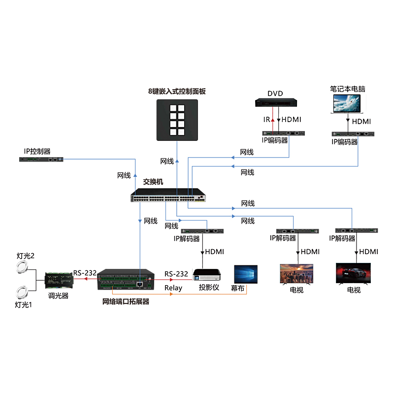 4, 4路双向 RS-232、1路双向 RS-485、2路低压 Relay、2路可配置为输入或输出的GPIO,以及2路支持20KHz~60KHz宽频的红外输出口