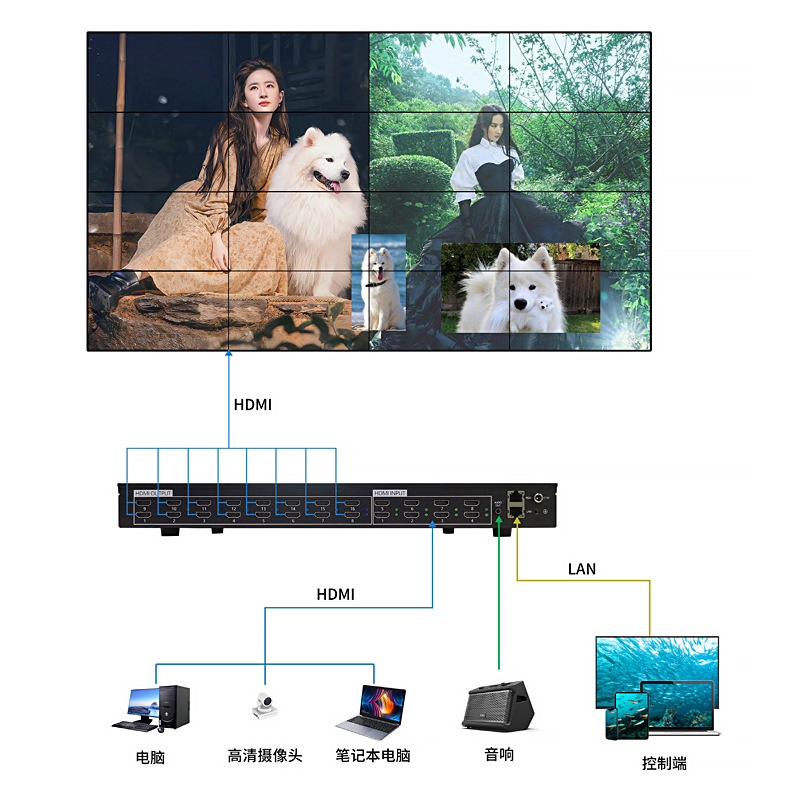 2, 支持任意视频信号上墙拼接、漫游、跨屏、放大缩小、画中画、画外画、画面叠加等;