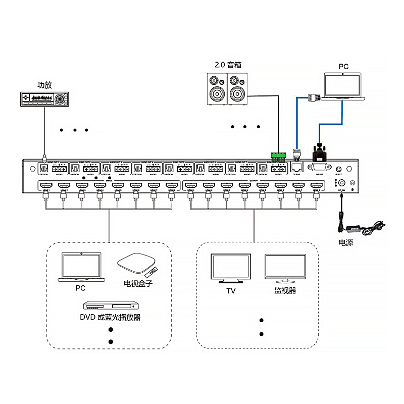 9, 支持WEB、IR、RS232、TCP/IP、Telnet控制,提供结构化控制指令;