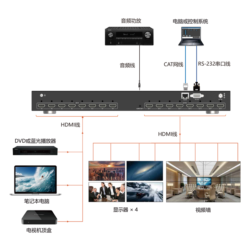 4, 支持简单拼接墙功能,拼接单元数量以输出口数量为限;