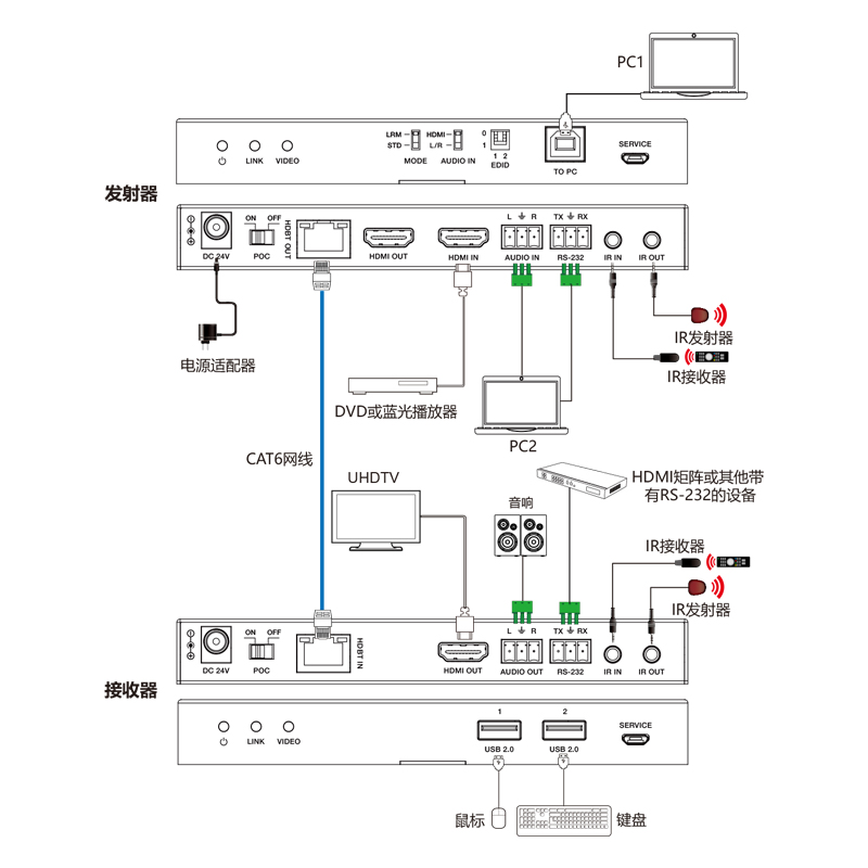 支持长距离模式,4K@30Hz 4:4:4 信号最远150米传输。可同时传输USB2.0、双向RS232、双向IR信号,支持远程供电。可设置固定 EDID,方便锁定输入信号格式。发送端支持模拟音频嵌入,接收端支持模拟音频解嵌。