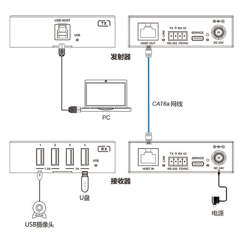 4, 接收端的 USB-A端口1和2 支持 5V/1.5A,端口3和 4 支持 5V/1A