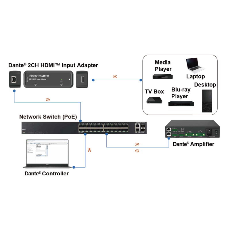 AT-S2HDE 是一款 Dante 的HDMI内嵌音频编码器。将HDMI PCM2.0内嵌音频转换为Dante 2CH数字音频,然后通过网络将音频传输到接收端,支持POE功能。