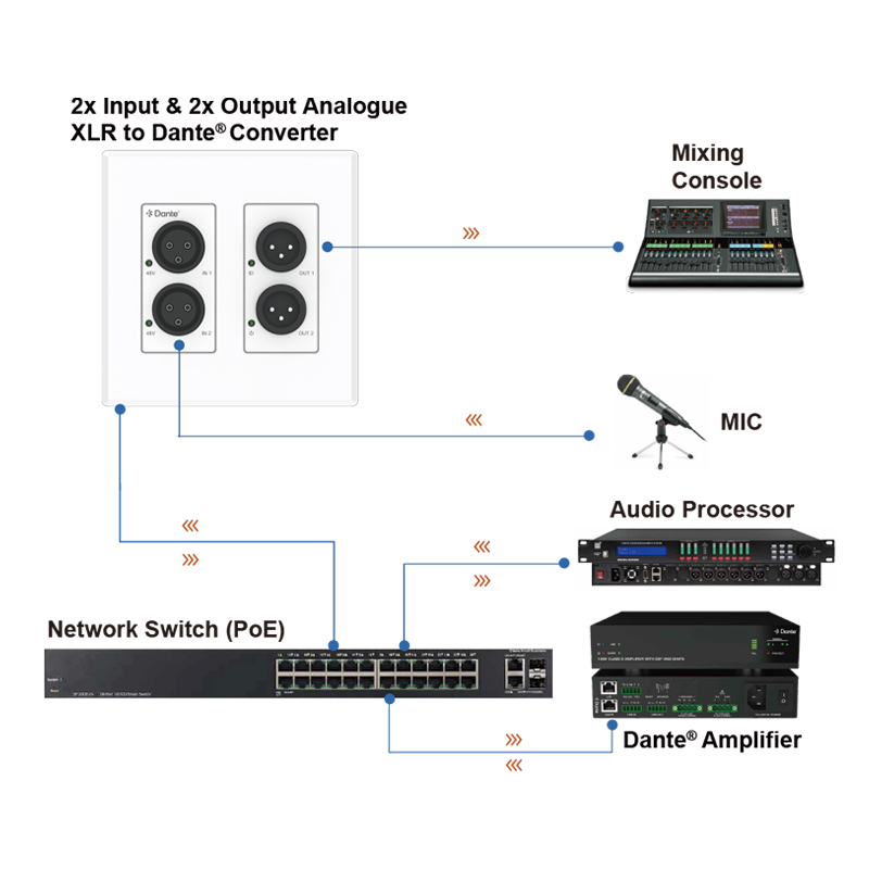 AT-P22XD 是一款面板型 Dante 的卡隆模拟音频编解码器,可以将2路XLR音频转为Dante,以及将 Dante 数字音频转为 2通道 XLR模拟音频,支持48V幻想供电开关,支持POE功能。