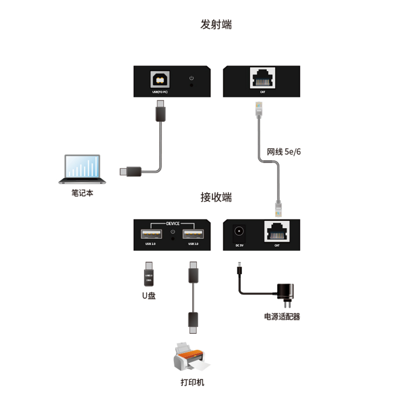 输入端口: 1×CAT [RJ45, 8-pin母座] 输出端口: 2×USB [USB-B, 4-pin母座] |